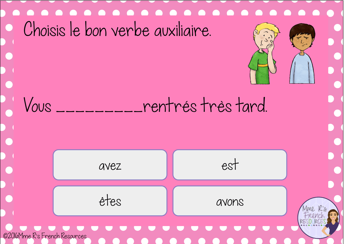 Mme R’s French Resources offers a complete resource to teach, reinforce and assess regular and irregular French verbs conjugated with avoir and être. This bundle, available at Teachers Pay Teachers, includes notes and exercises, exit tickets, activities, games, Boom Cards and traditional task cards, and a trip to Paris (Powerpoint) project that can be used as a final assessment. Try a Boom Cards free sample for a taste: